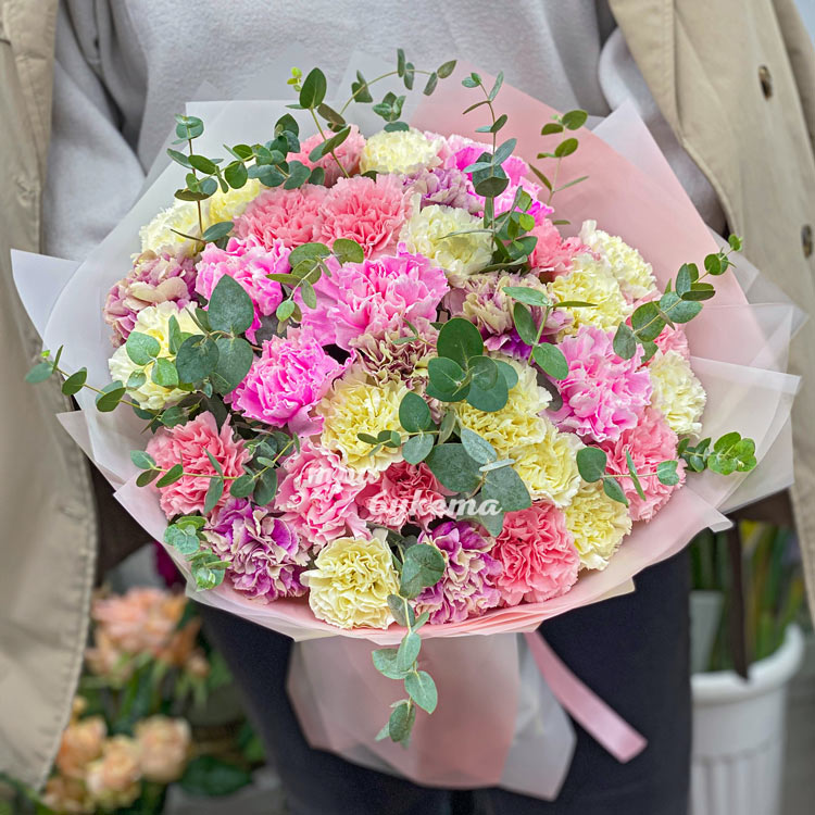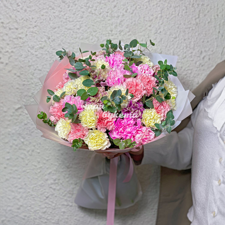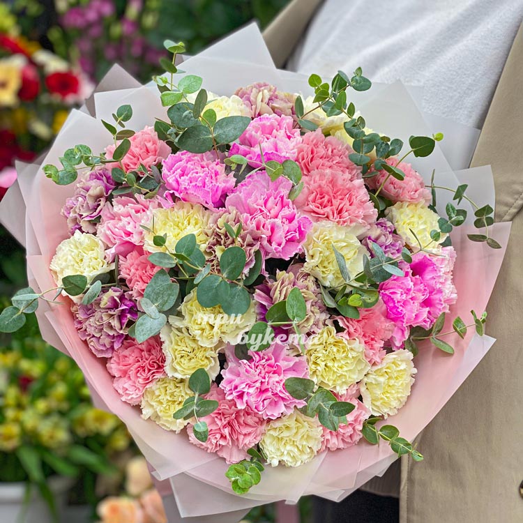 Букет 35 цветных гвоздик с эвкалиптом