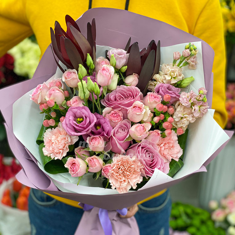 Букет из розовых роз и диантусов