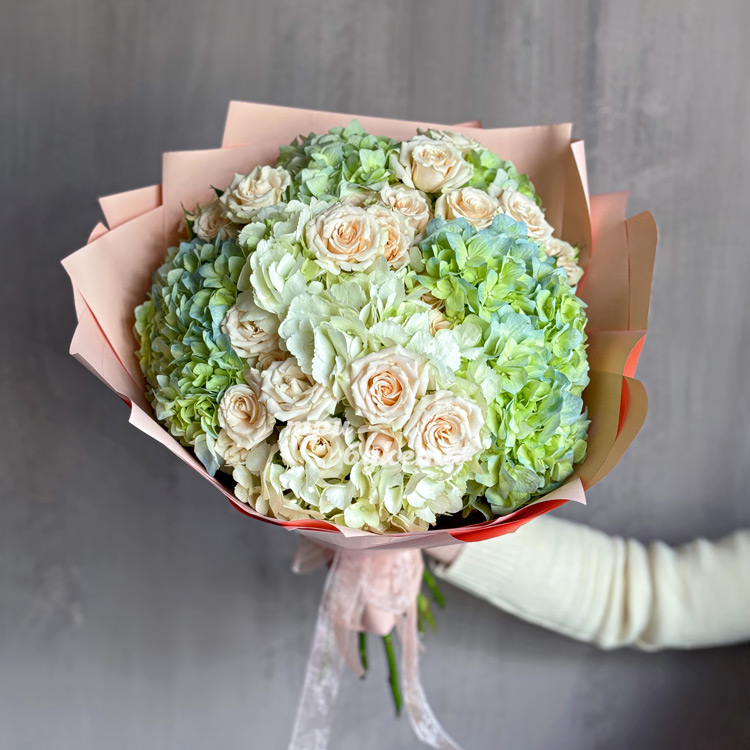 Букет кремовых роз и зеленых гортензий