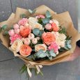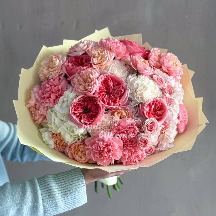 Букет розовых пионовидных и кустовых роз