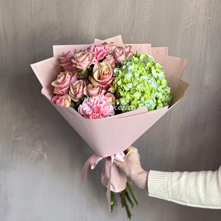 Букет розовых роз с зеленой гортензией