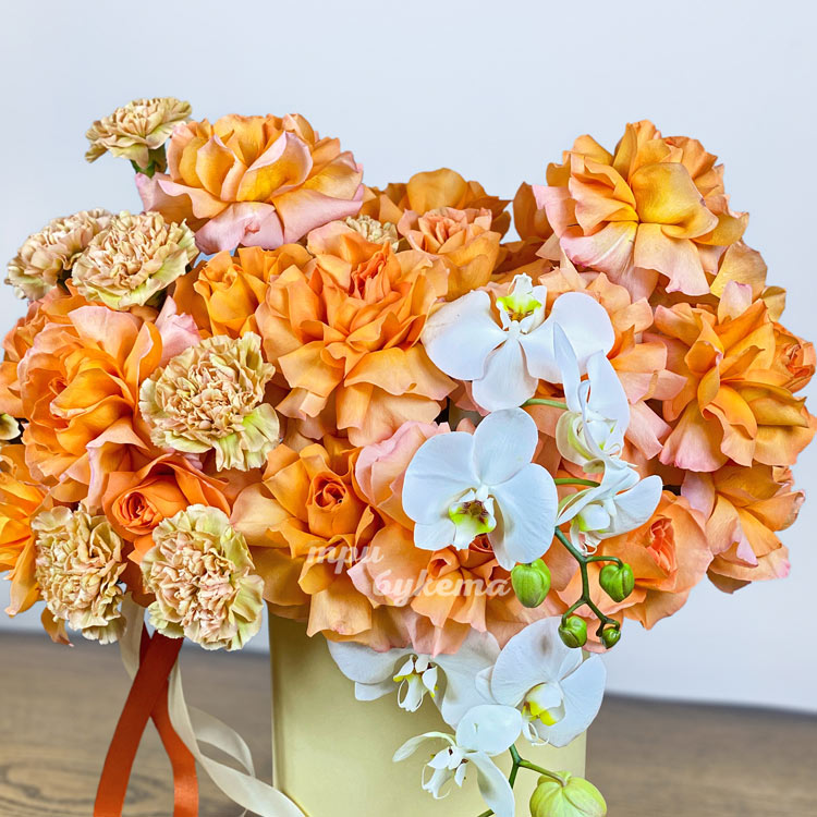 Коробка орхидей, гвоздик и роз Шиммер
