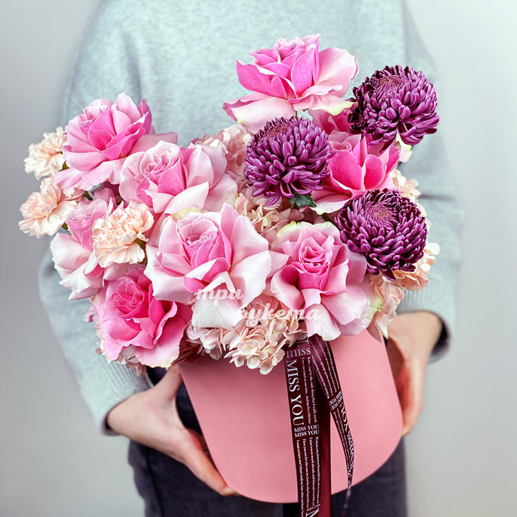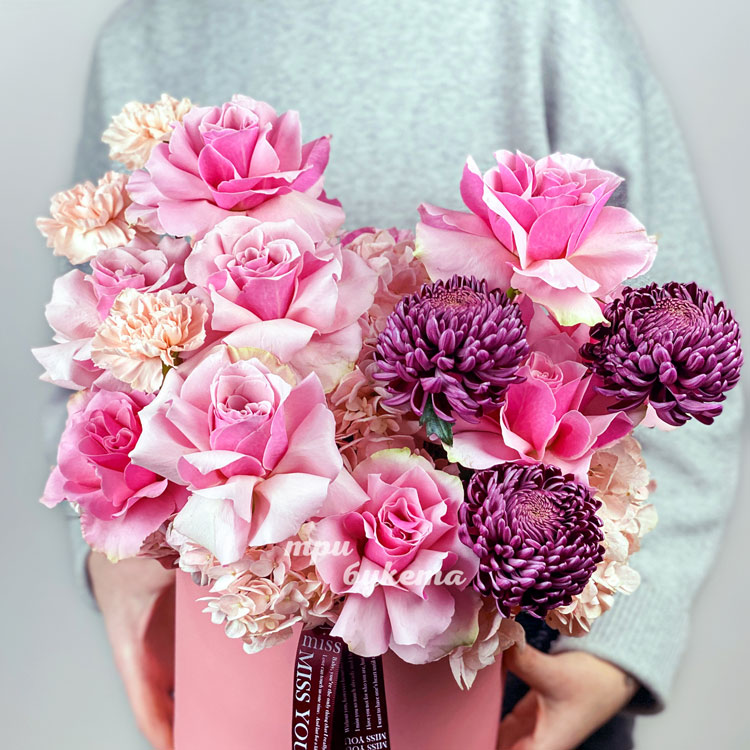 Коробка розовых французских роз и хризантем