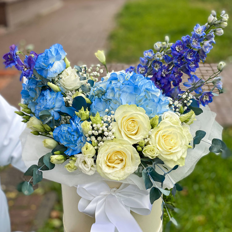 Коробка с эустомами, гвоздиками и розами