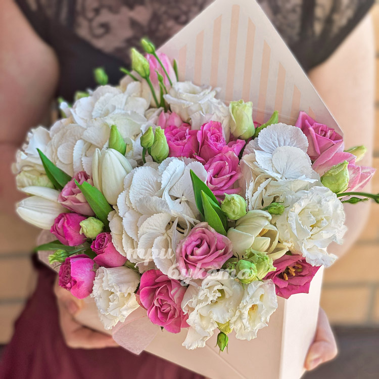 Коробочка с тюльпанами и гортензией