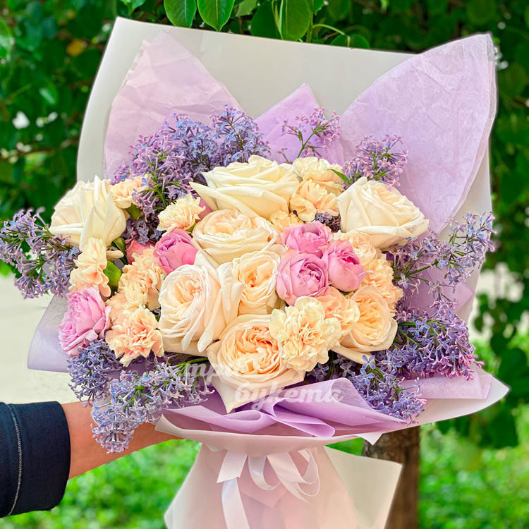 Кремовые розы и гвоздики с сиренью