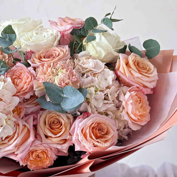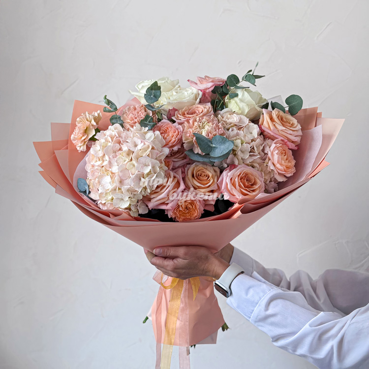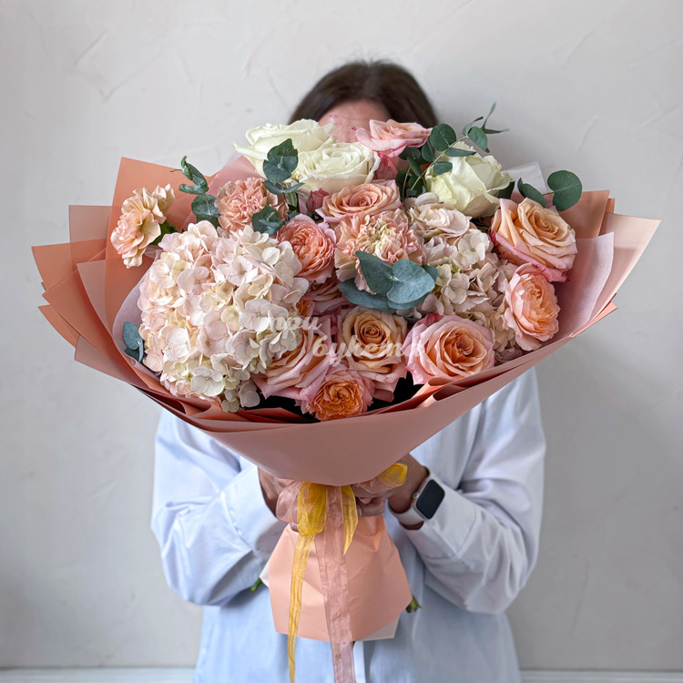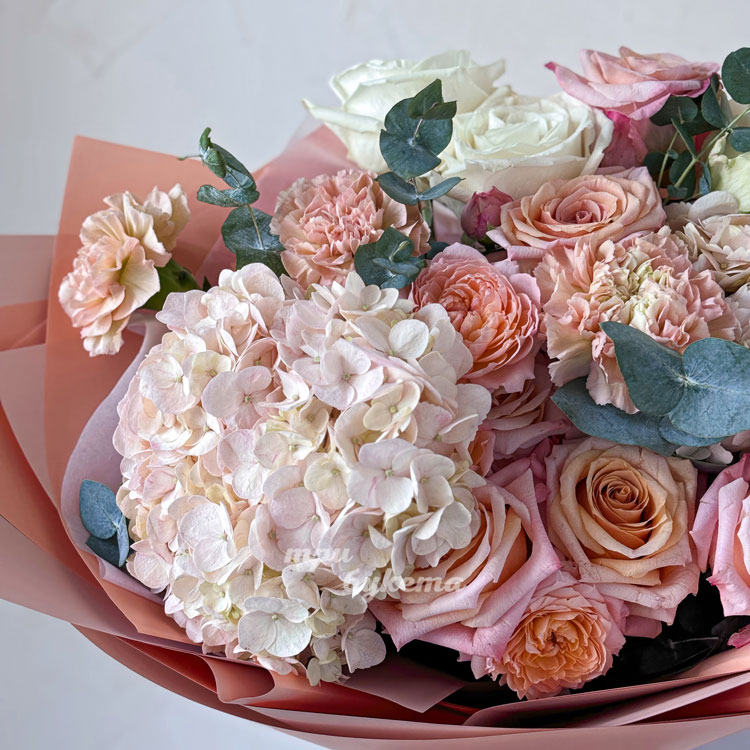 Нежно-персиковый букет роз и гортензий