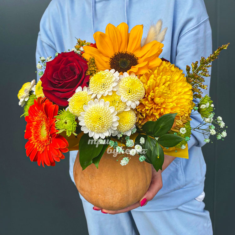 Осенняя композиция хризантем и гербер в тыкве