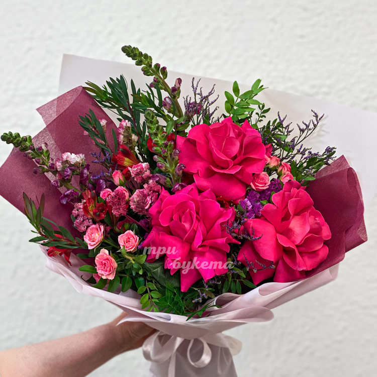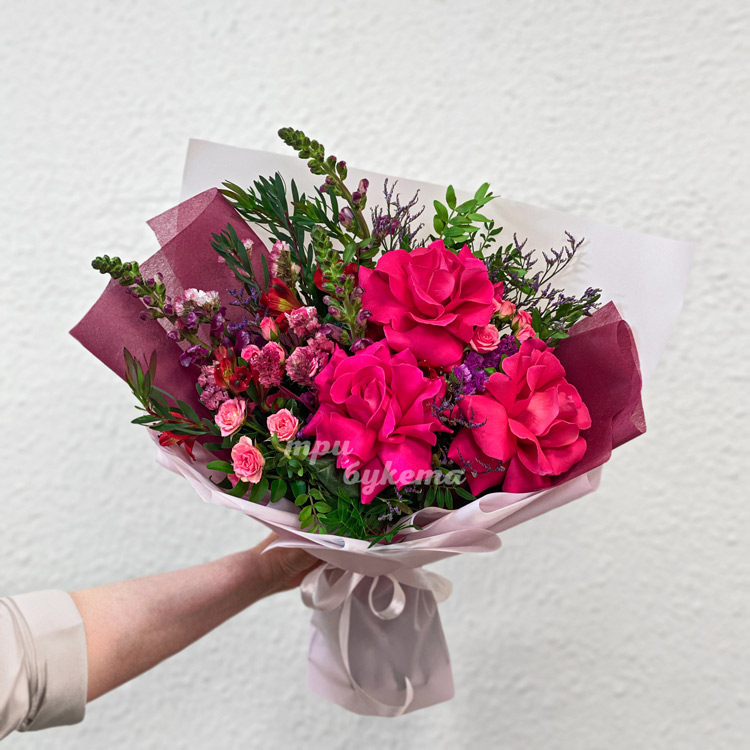 Розовый букет роз, антирринумов и зелени