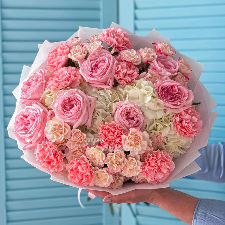 Розовый букет роз, диантусов и гортензий