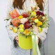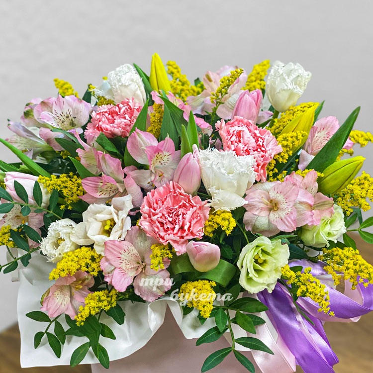 Тюльпаны, гвоздики и альстромерии в коробке