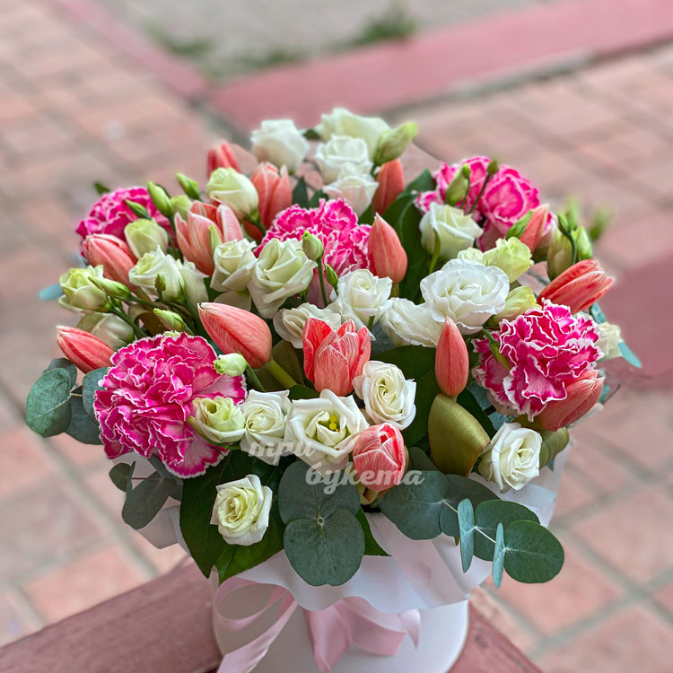 Тюльпаны, гвоздики и эустомы в коробке