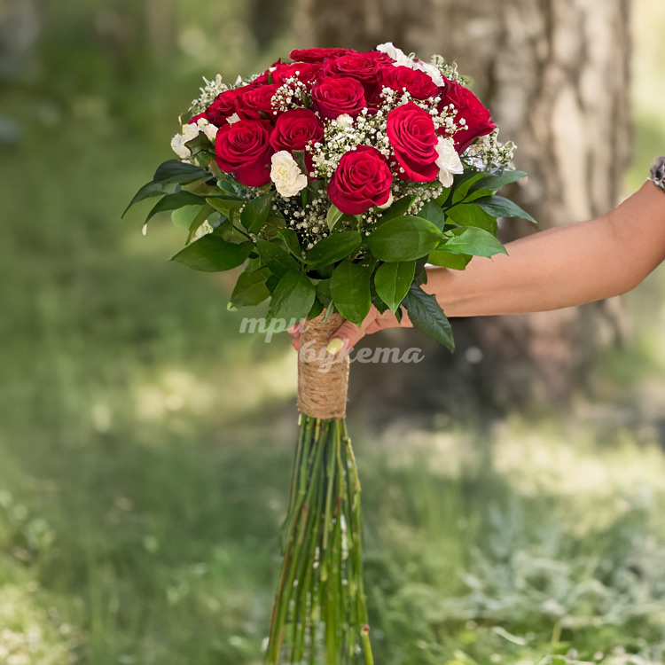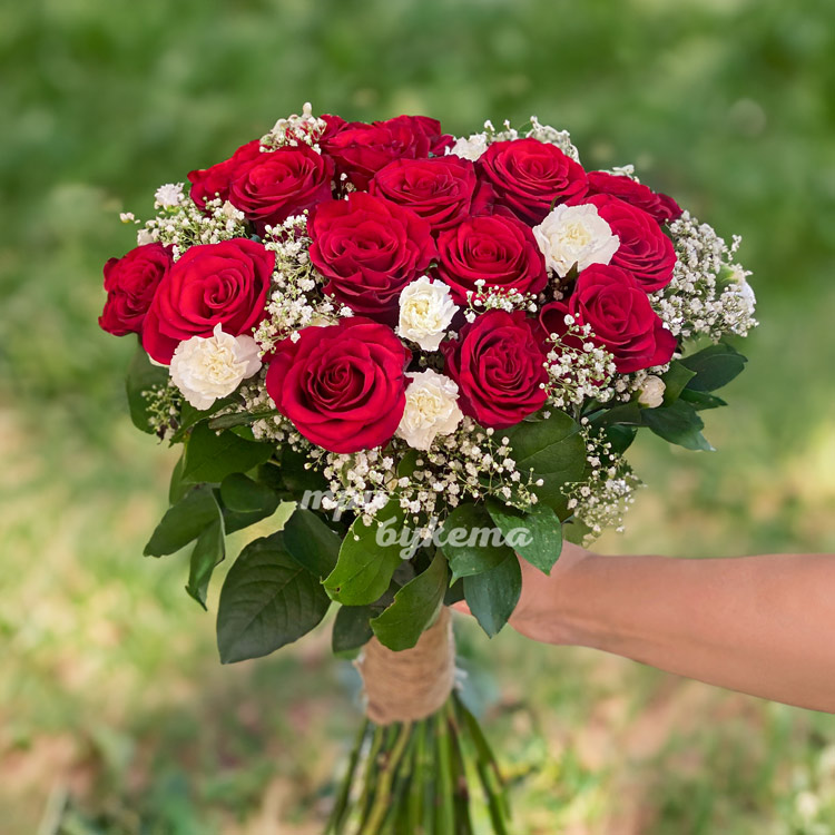 Высокие красные розы с белыми гвоздиками